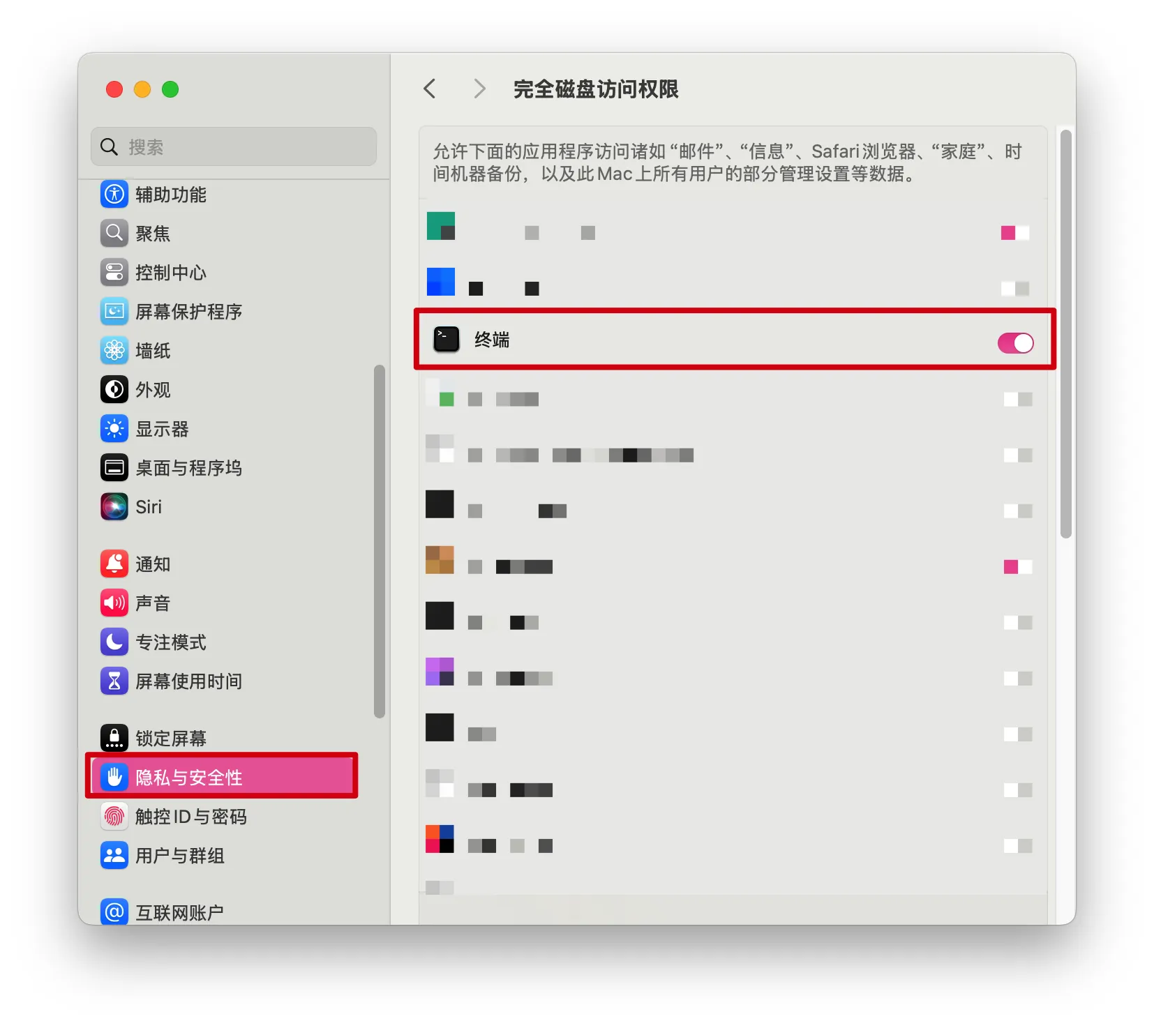 【踩坑】MacOS终端没有目录访问权限 发表于 2025-03-16 更新于 2025-12-26 阅读次数: 前言MacOS系统升级后,终端没有目录访问权限,报错:ls: .: Operation not permitted 解决问题 授予或重新授予终端的完全磁盘访问权限 完成参考文献CSDN——韩家小志