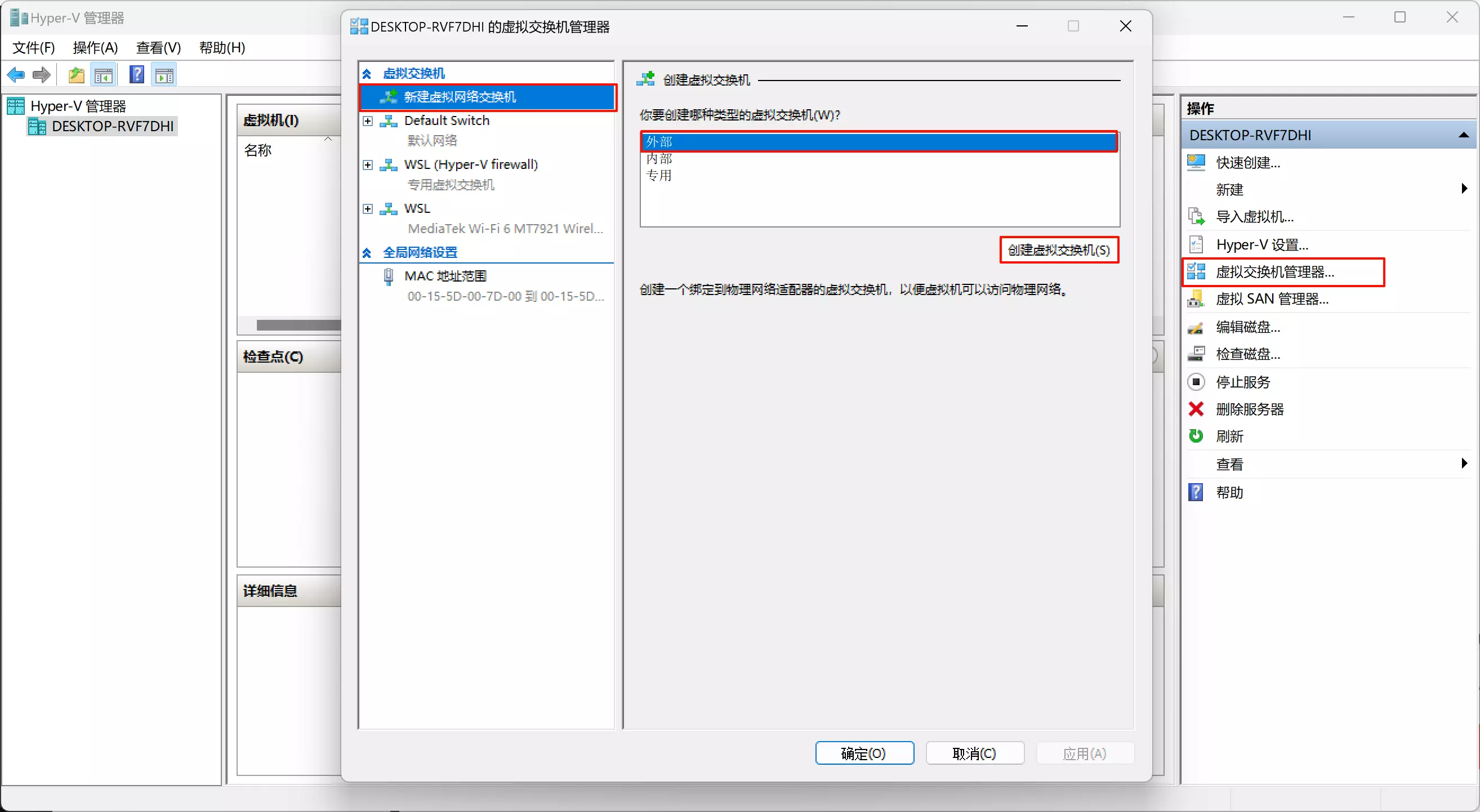 虚拟交换机管理器->新建虚拟网络交换机->外部->创建虚拟交换机