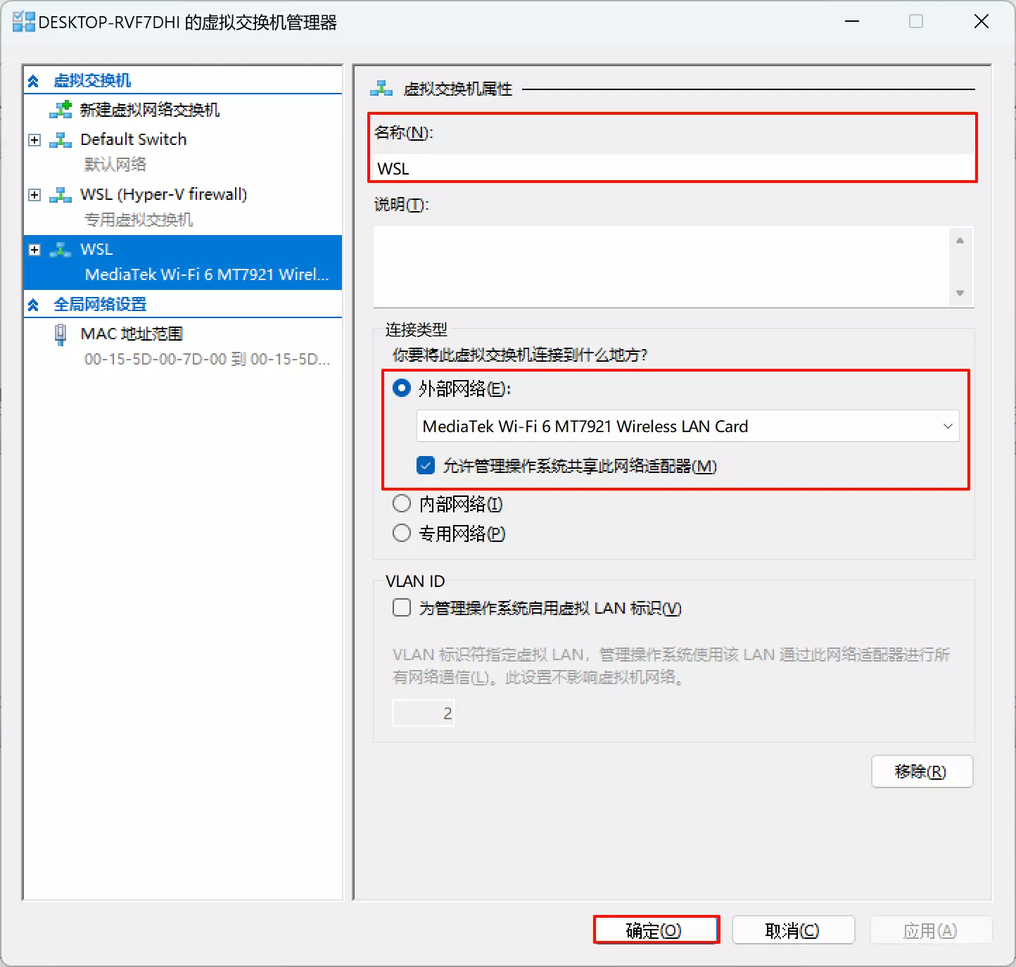 WSL->勾选外部网络并选择需要桥接的网卡->确定