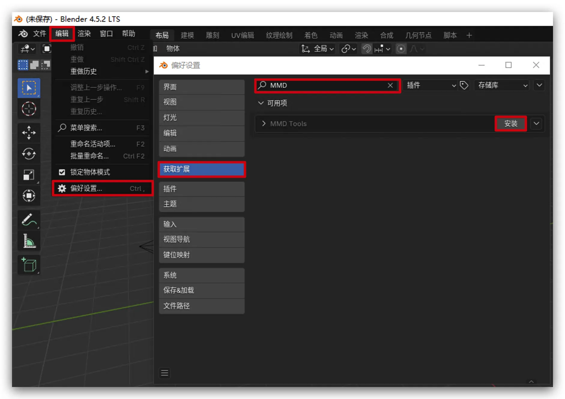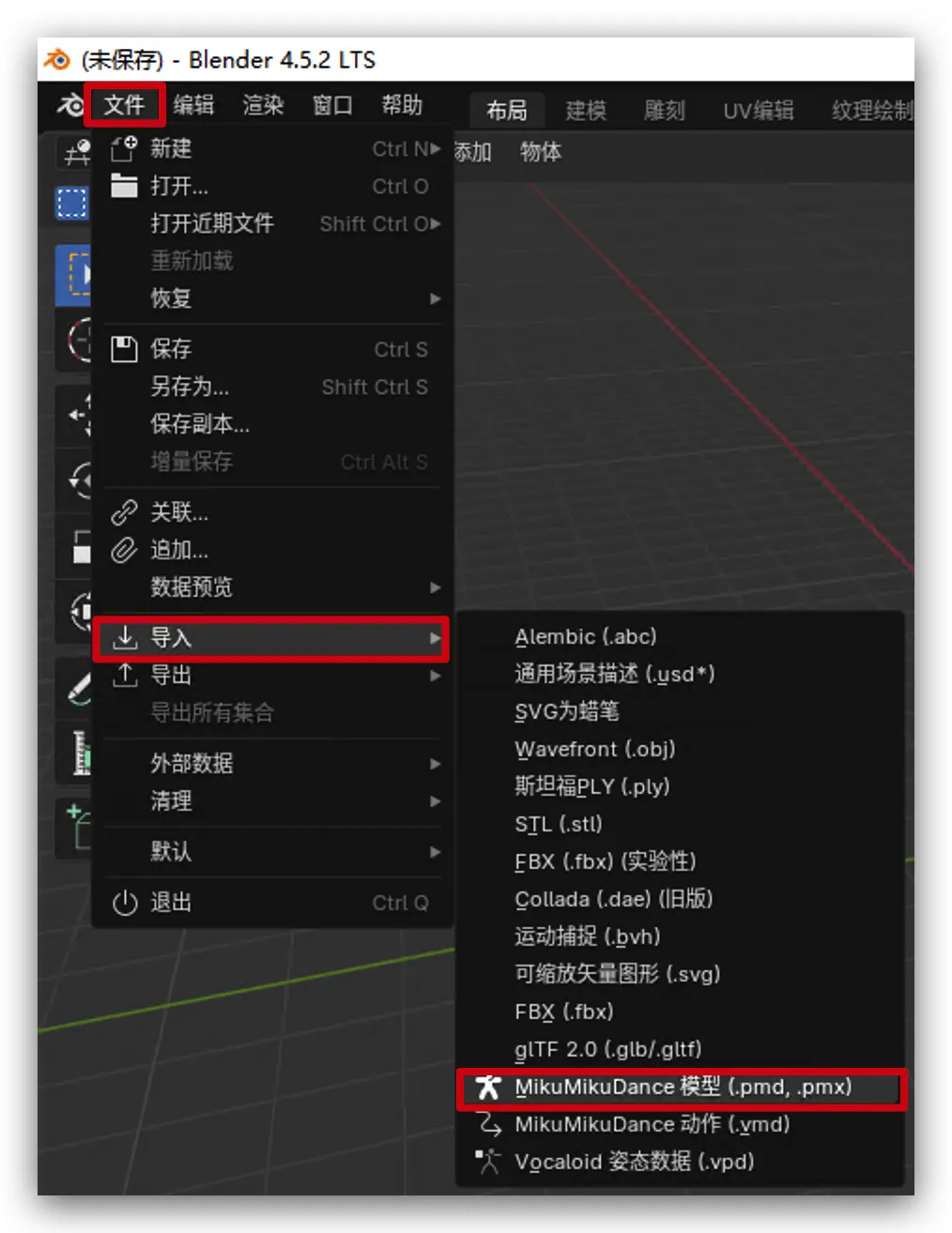 【笔记】Blander导入pmx文件 发表于 2025-09-06 更新于 2025-12-26 阅读次数: 前言Blander导入pmx文件 安装插件 编辑->偏好设置->获取扩展->搜索MMD,安装MMD Tools插件 导入文件 文件->导入->MikuMikuDance模型 完成参考文献哔哩哔哩——CVN-65