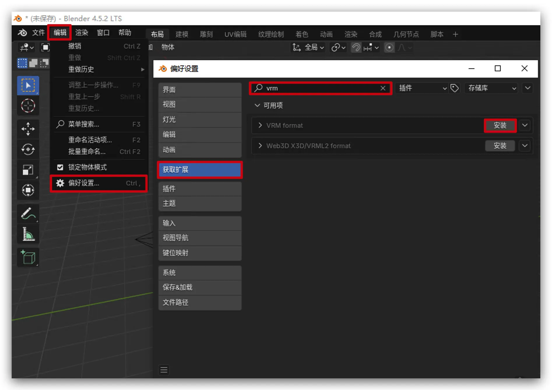 【笔记】Blander导出vrm文件 发表于 2025-09-06 更新于 2025-12-26 阅读次数: 前言Blander导出vrm文件 安装插件 编辑->偏好设置->获取扩展->搜索vrm,安装VRM format插件 导入文件 文件->导出->VRM 完成参考文献哔哩哔哩——夕蓝资源网