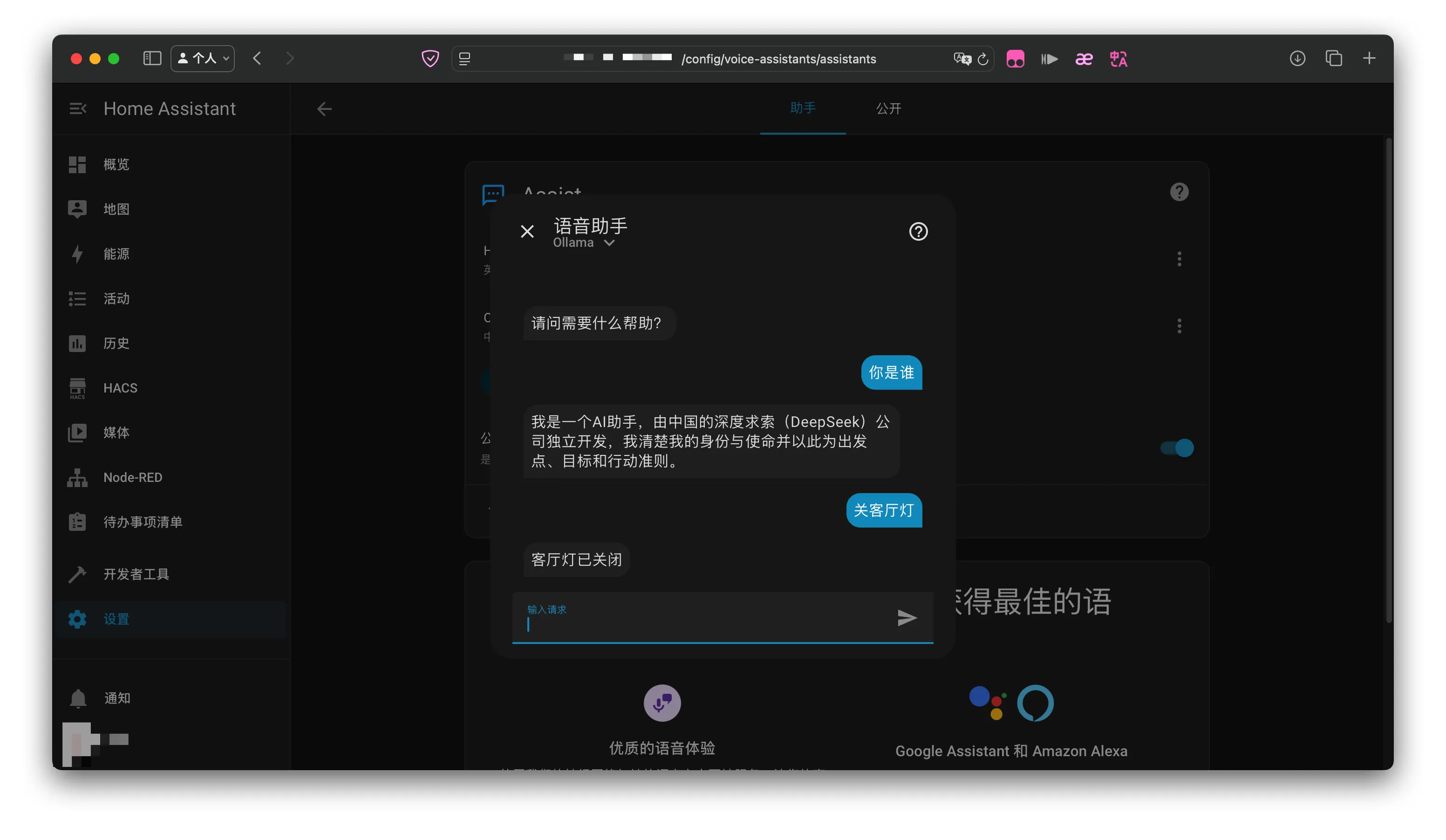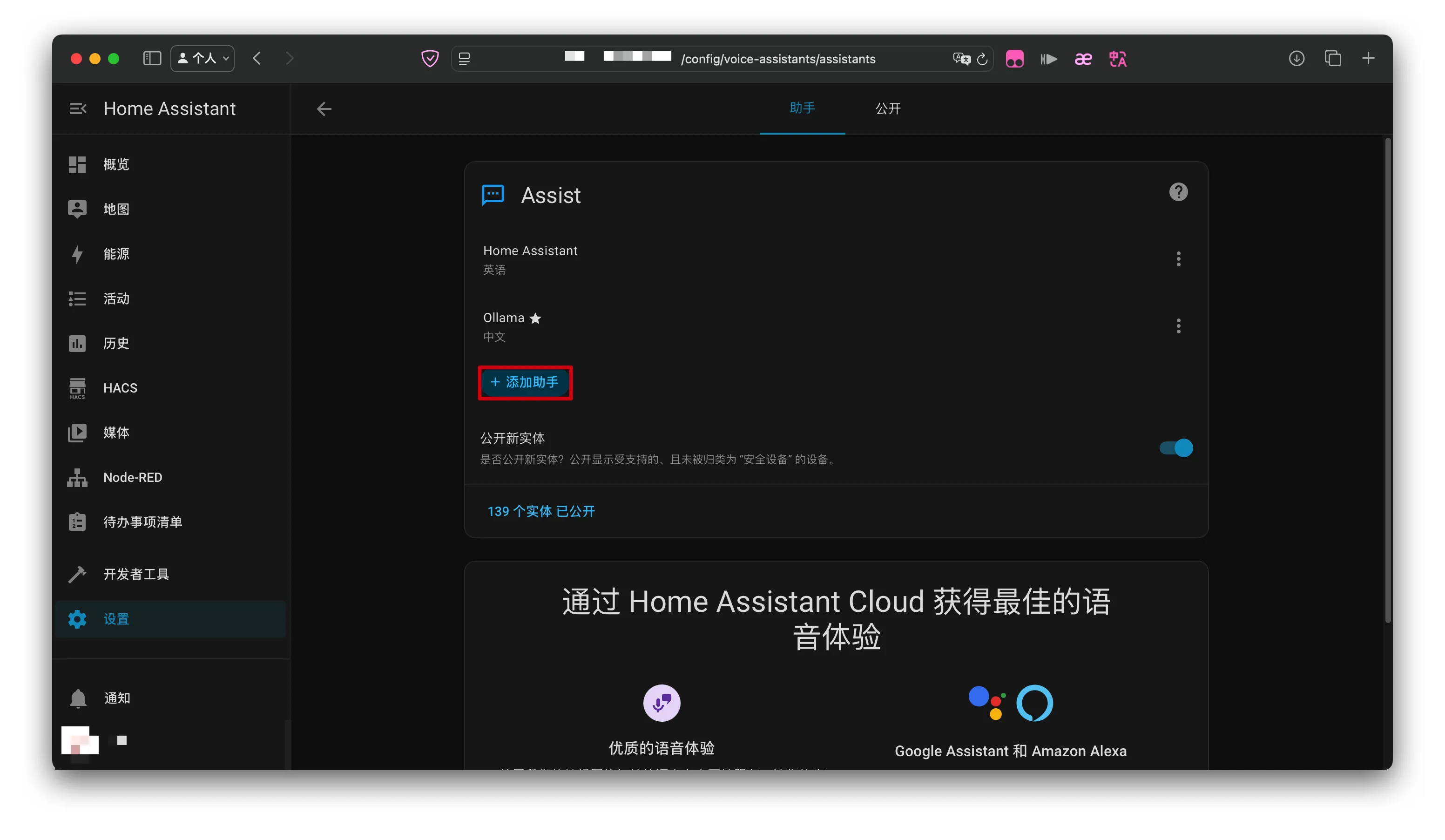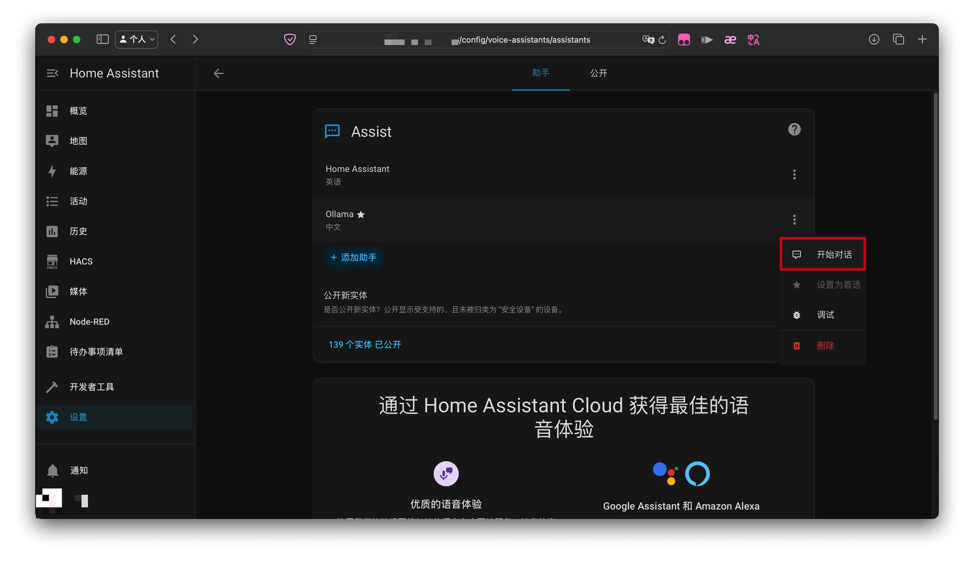 【笔记】HomeAssistant将Ollama作为Assist 发表于 2025-10-05 更新于 2025-12-16 阅读次数: 前言HomeAssistant将Ollama作为Assist 准备工作 启动Ollama服务 传送门 添加Ollama集成 设置->设备与服务 添加集成->搜索Ollama->Ollama 网址填写Ollama服务器的URL->提交->进入Ollama集成 添加对话代理->选择模型(Ollama服务器没有下载的模型会先下载)->定义提示词(通过/no_think阻止模型思考)->如果需要对话助理操作设备可以勾选Assist->提交 配置语音助手 设置->语音助手 添加助手 指定配置名称->指定对话代理->创建 设置为首选 调试 开始对话 完成参考文献CSDN——小白菜菜菜菜菜菜菜菜菜菜菜菜