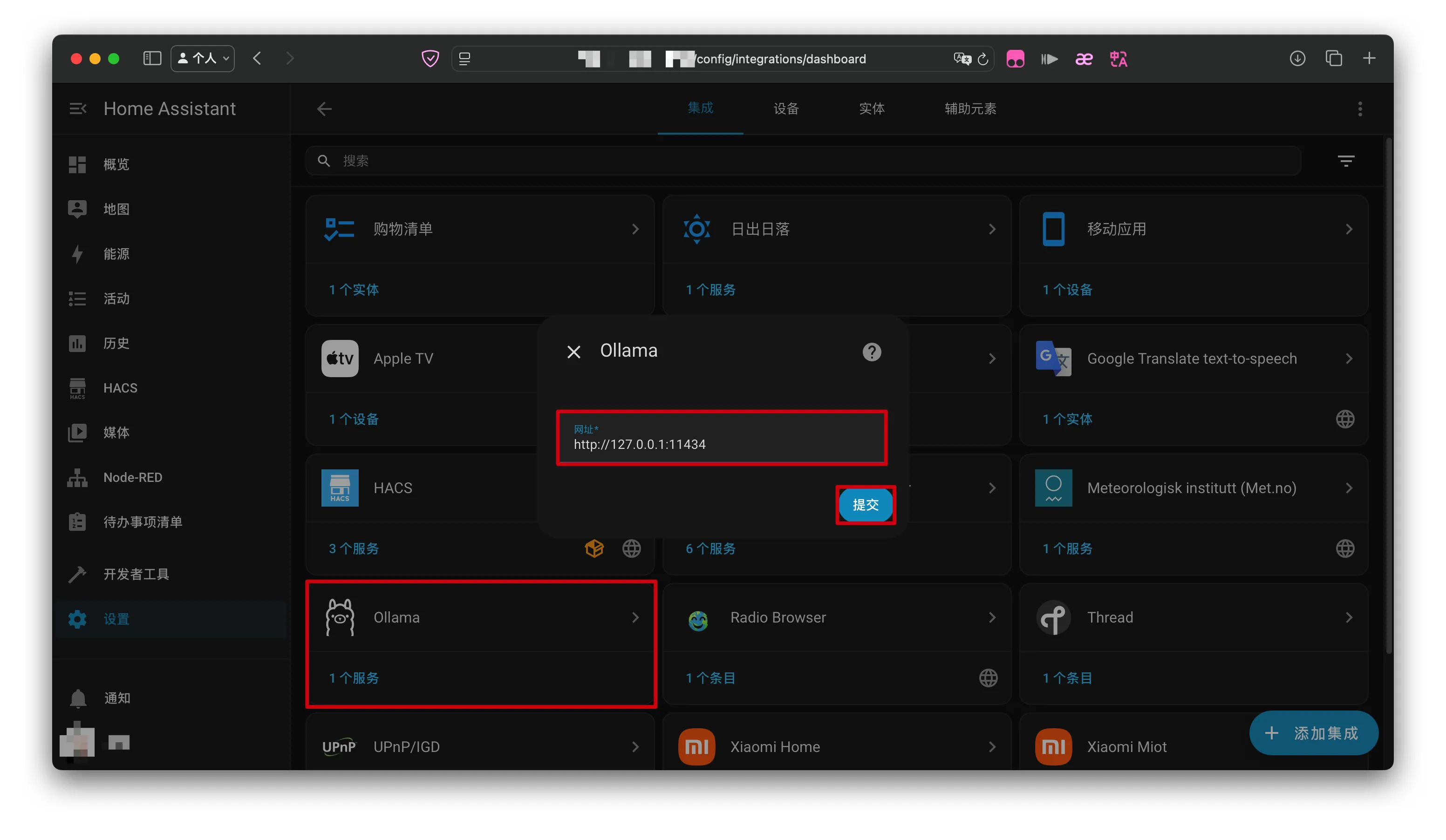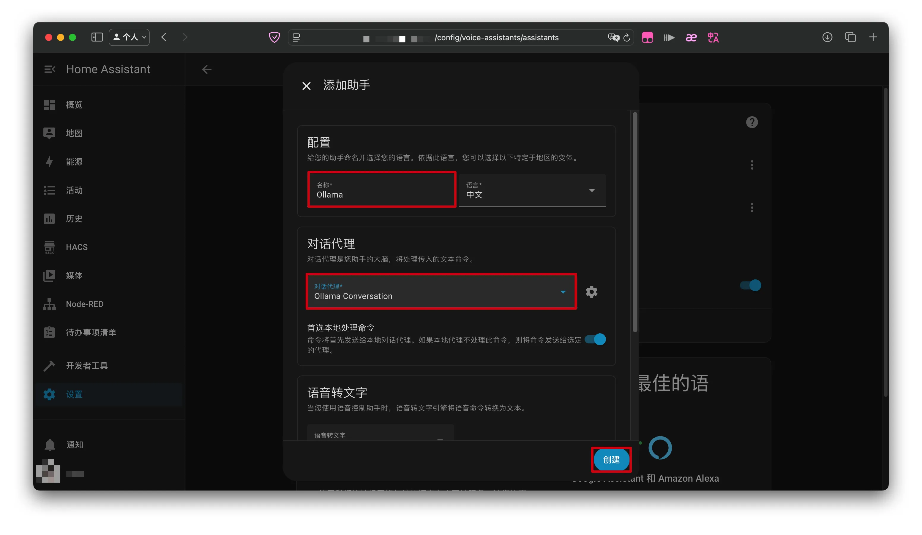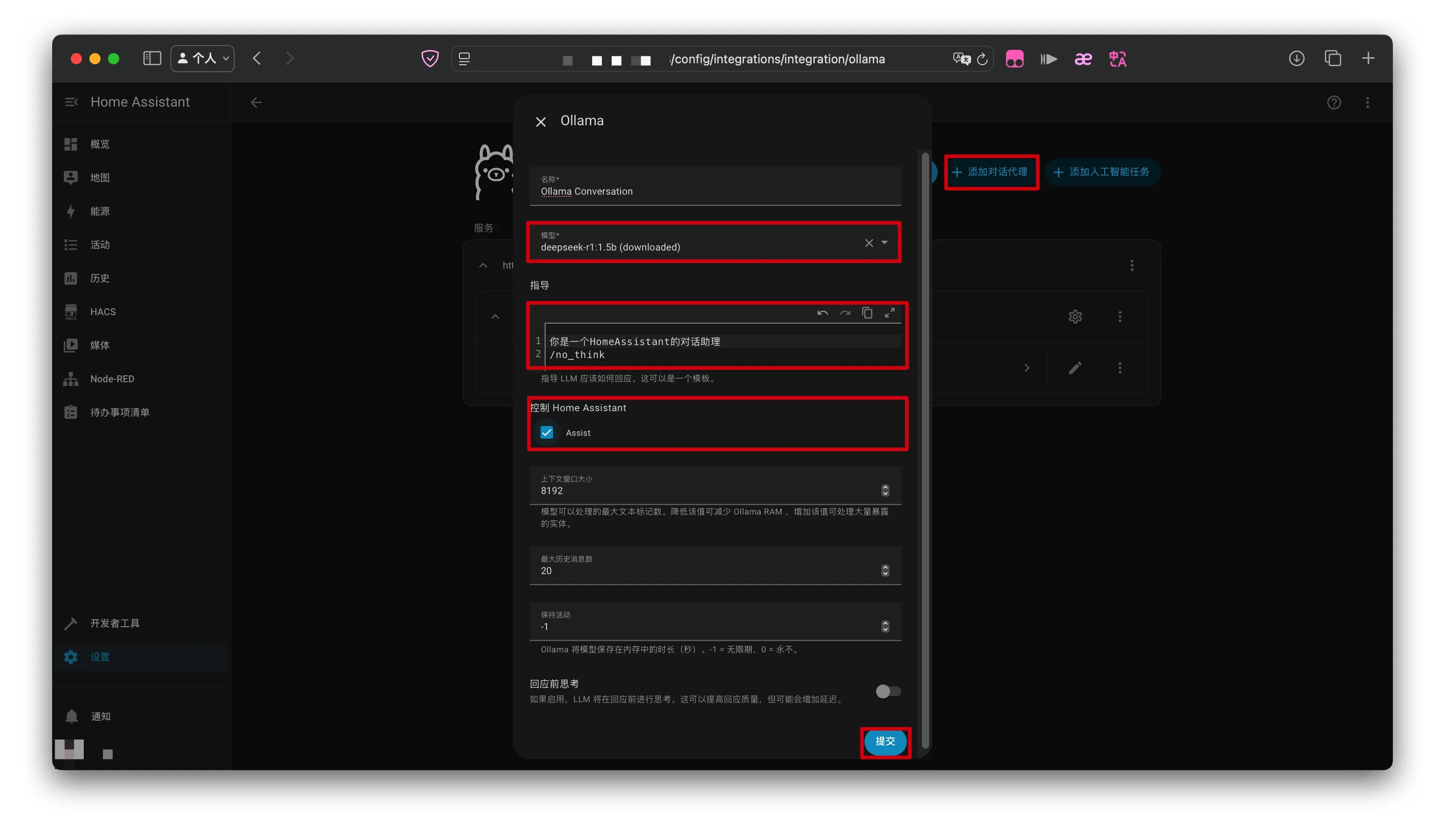 【笔记】HomeAssistant将Ollama作为Assist 发表于 2025-10-05 更新于 2025-12-16 阅读次数: 前言HomeAssistant将Ollama作为Assist 准备工作 启动Ollama服务 传送门 添加Ollama集成 设置->设备与服务 添加集成->搜索Ollama->Ollama 网址填写Ollama服务器的URL->提交->进入Ollama集成 添加对话代理->选择模型(Ollama服务器没有下载的模型会先下载)->定义提示词(通过/no_think阻止模型思考)->如果需要对话助理操作设备可以勾选Assist->提交 配置语音助手 设置->语音助手 添加助手 指定配置名称->指定对话代理->创建 设置为首选 调试 开始对话 完成参考文献CSDN——小白菜菜菜菜菜菜菜菜菜菜菜菜
