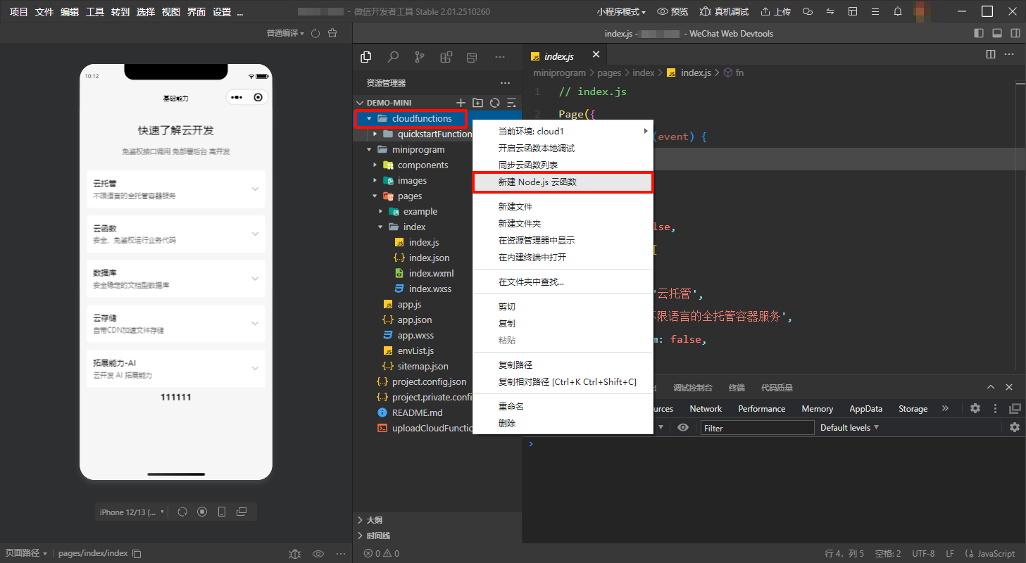 cloudfunctions->新建 Node.js 云函数->定义云函数名称,确认后会自动上传